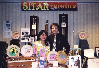 That's us, Sitar Emporium's GiGi & Clar Monaco. All dressed up for the opening night 60's dance party, I took one of our hand-painted souvenir tambourines with me, while Clar manned the booth. Hey, I was 'working'. Other folks had our tambourines at the dance too! |