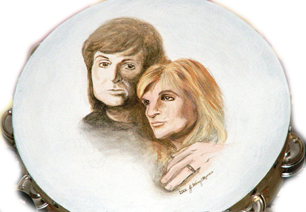 Tribute to Paul & Linda, "My Love". Double portrait. 10-in tambourine. $175 Linda playing tambourine, red stage lights. $65 |