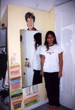 Harry Pottertm Mural 2000 for children's bedroom. When I did this, I did not know who or what Harry Potter or Dobby was. I was given the book series and picked, what I thought was the best cover illustration of this boy wizard. By the time I finished this mural (less than a week), 'Curious, indeed', did I become about "Harry Potter". The young girl pictured below is Jessica, my niece who introduced to the World Of Harry Potter. |
